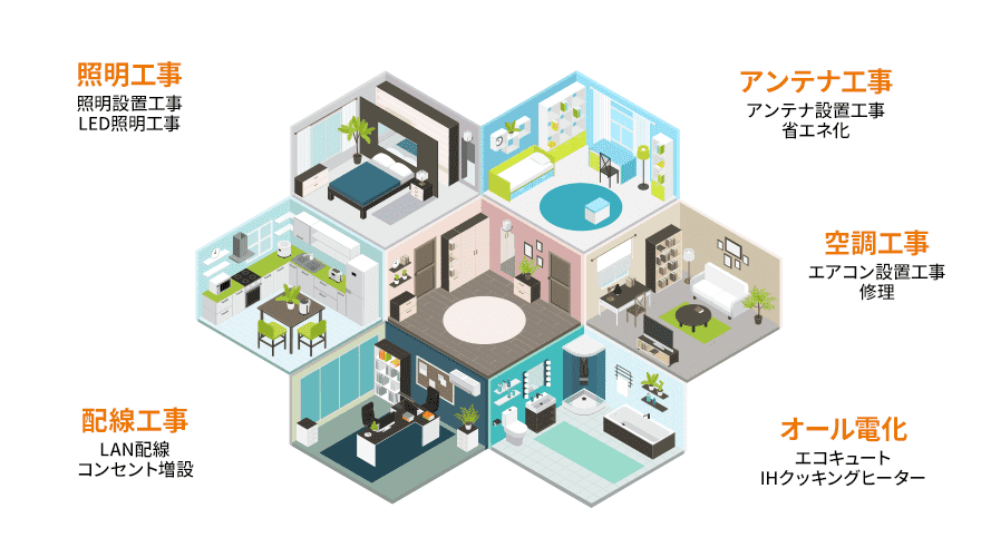 エアコン、照明、コンセント、アンテナ、ブレーカーなど、電気工事に関することならなんでもご相談ください。まずはお電話・メールにてお気軽にお問い合わせを。